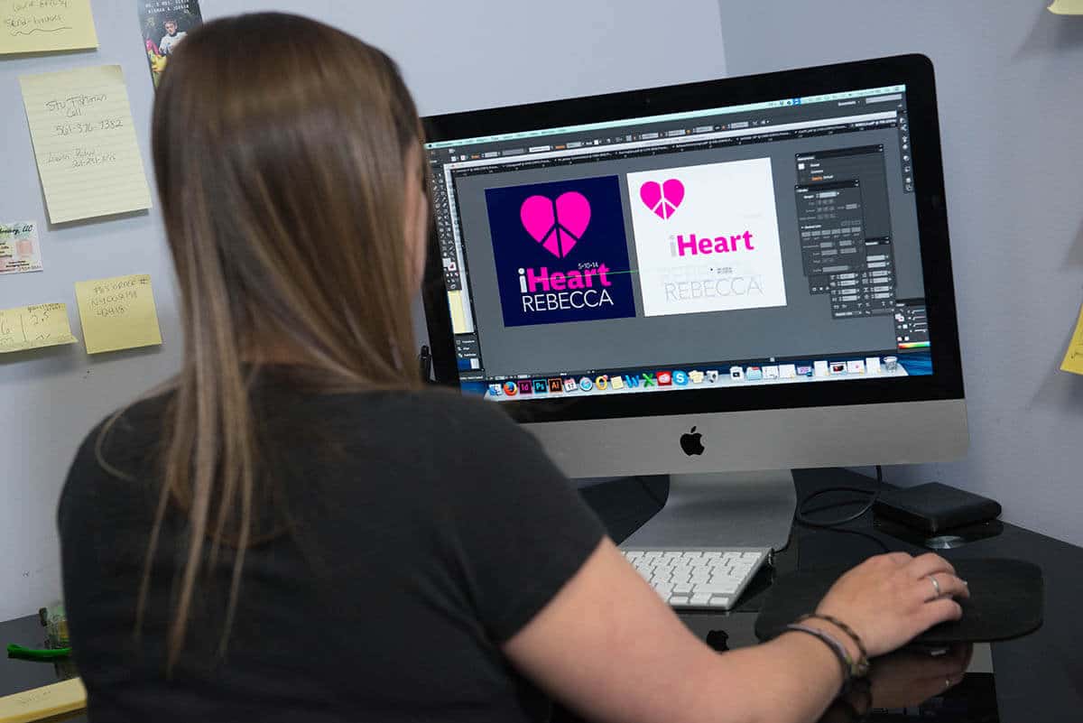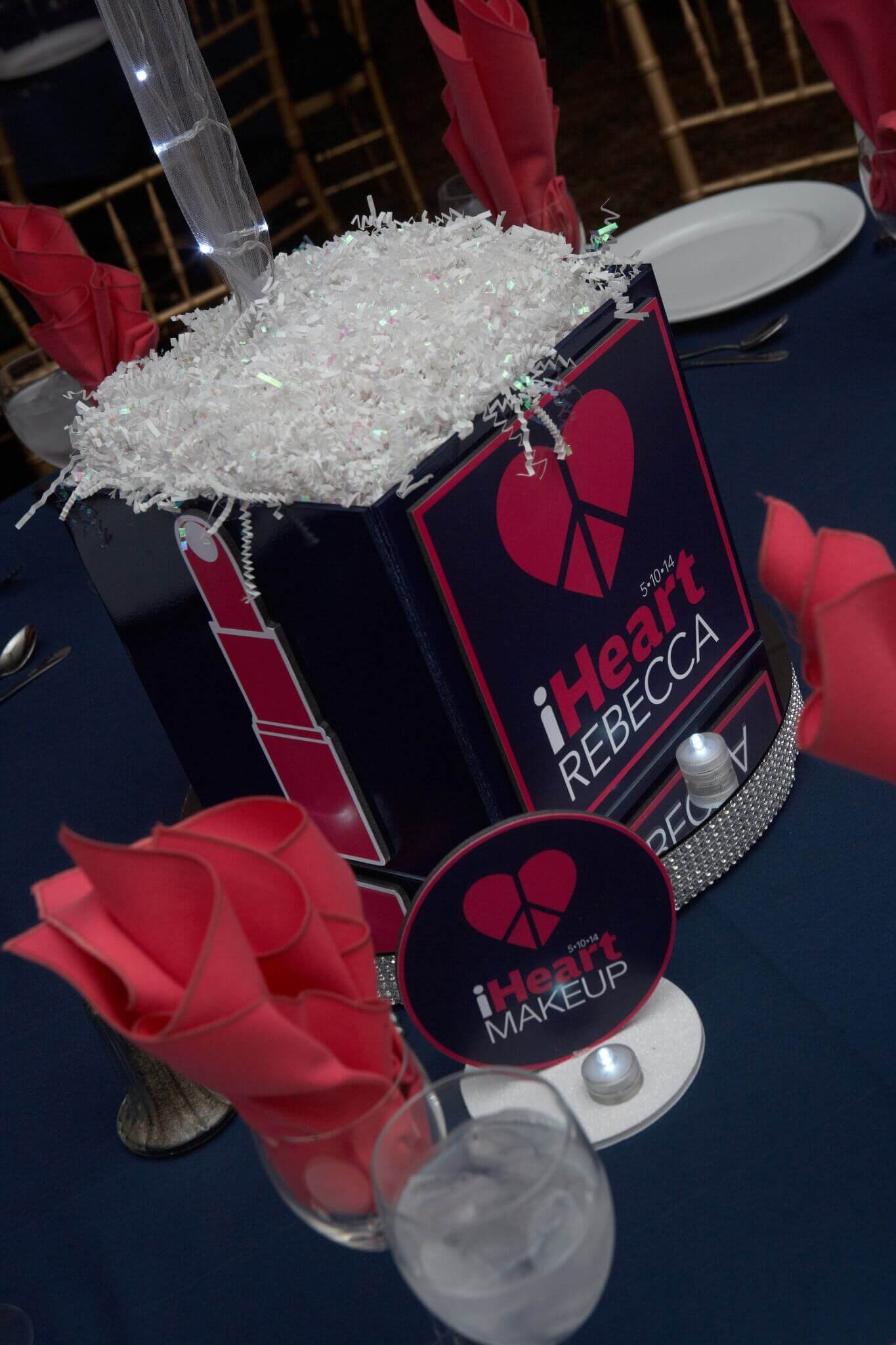 Rebecca’s logo features a piece of the Bethany Mota Trademark which combines a heart & a peace sign. We used the famous “I Heart Radio” slogan and layout to combine her Logo Icon and Text. The final result was then rearranged into multiple layouts for different formats. We used one version on the centerpieces, one on the custom backdrop & a third for the party favors with an alternate color for the boys.